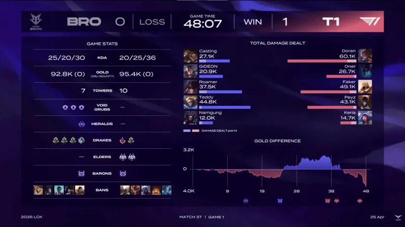虎扑04月25日讯 【GAME1】BRO蓝色方、T1红色方