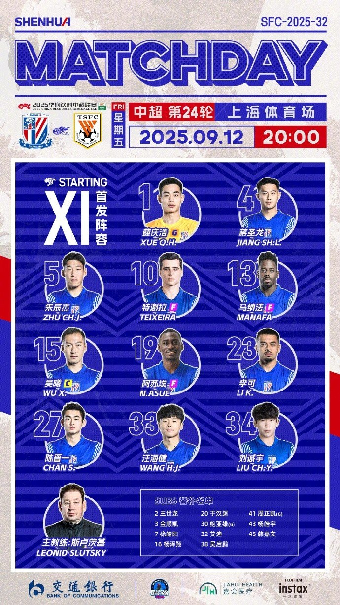 上海申花首发:1-薛庆浩、4-蒋圣龙、5-朱辰杰、13-马纳法(F)、27-陈晋一、15-吴曦、23-李可、33-汪海健、10-特谢拉(F)、19-阿苏埃(F)、34-刘诚宇
