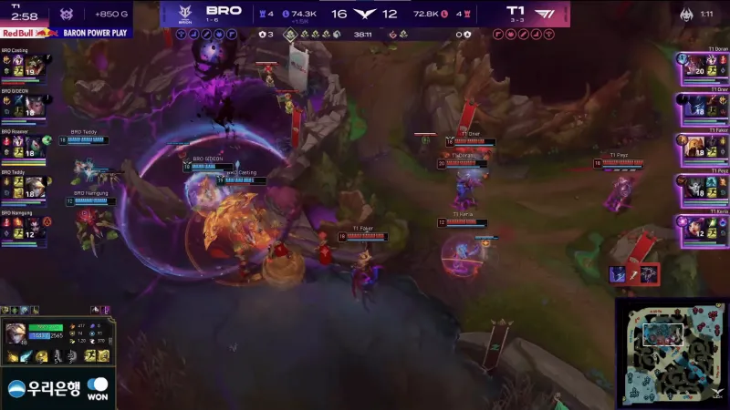 比赛第33分钟,BRO中路激战打出2换2,但此后BRO打大龙被Oner梦魇抢到。