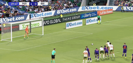 第30分钟,克莱因造点,克里斯-朗主罚点球命中,布里斯班狮吼1-1